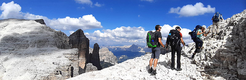 | Mi. | Tucketthütte 2268 m – Bocca di Brenta – Rifugio Selvata 1630 m Heute geht es durch das Herz der Brentagruppe, vorbei an traumhaft schöner Landschaft und schroffen Felstürmen wandern wir über schmale Felsbänder zur Brenteihütte. Nach einer Rast Aufstieg durch ein langgezogenes Tal, dann über große Felsblöcke des Restgleschers und eine steile Felsstufe (exponiert - Seilversicherungen) auf die Boccha di Brenta 2552 m und weiter zum Rifugio Tosa Pedrotti. Hier verlassen wir nach einer weiteren Rast die herrliche Brentagruppe durch ein spektakuläres Felsbecken. Über Massodi geht es stetig abwärts bis zum Erreichen des Waldes, wo auf einer schön gelegenen Waldlichtung die kleine Selvatahütte liegt. Gehzeit ca. 6 - 7 Stunden, Höhenmeter Aufstieg: ca. 608 m Abstieg: ca. 1226 m, Km 11,7 |