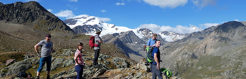 | Mo. | Höchsterhütte 2561 m - Gleckspitze 2957 m - Dorigonihütte 2436 m Über einen schönen Panoramasteig passieren wir zuerst die Staumauer, dann geht es unter den steilen Bergwänden entlang zum Langsee und weiter zum Schwarzsee. Ein steiler Aufstieg erwartet uns nun zum Schwärzer Joch auf 2825 m und auf den Gipfel des Gleck 2957 m. Abstieg über einen schmalen Steig zur Dorigonihütte 2436 m. Gehzeit ca. 5 Stunden, Höhenmeter Aufstieg: ca. 600 m, Abstieg ca. 750 m, Km 10 |
