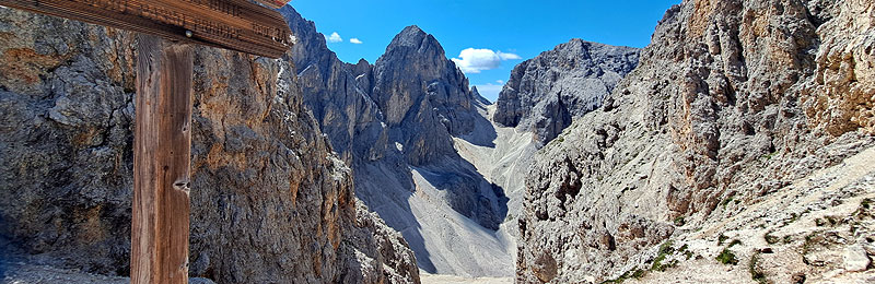 | Mo. | Cigoladepass - Vajolethütte Wanderung über den Masare Panoramaweg vorbei am Christomannos Denkmal zur Rotwandhütte. Hier steigt der Weg nun steiler an zum Cigoladepass 2550 m und wir queren unterhalb der steil aufragenden Rosengarten Ostwand zur Vajolethütte 2250 m. Gehzeit: ca. 3 - 4 Stunden, 580 m Höhenmeter, 470 m Abstieg, Km 8 Nachmittags fakultativ und ohne Gepäck Aufstieg zu den Vajolettürmen (steil und ausgesetzter Steig mit Stahlseilsicherung) Gehzeit: ca. 2 Stunden, Höhenmeter Aufstieg/Abstieg: ca. 380 m - Km 1 |