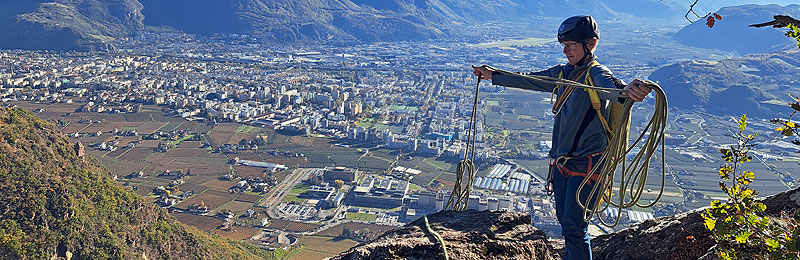 Arrampicata sulle pareti di porfido rosso sopra Bolzano