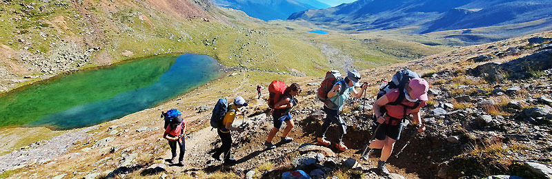 | Do. | Rifugio Vallanta - Rifugio du Viso 2460 m Über eine Reihe von Kehren steigen wir auf bis zu den Vallanta-Seen 2710 m und weiter bis zum Passo di Vallanta 2811 m, der Hauptwasserscheide und italienisch-französischen Grenze, zwischen dem Monte Losetta und der Punta Gastaldi. Vom Pass aus steigen wir über steiles steiniges Gelände ab zur schönen Conca del Lac Lestio, wo der Fluss Guil beginnt. Über große Almen und nach einem letzten kleinen Aufstieg erreichen wir das Rifugio del Viso 2460 m. Nachmittags Ausflug zum schön gelegenen Lac Porcieroles 2645 m. Gehzeit: ca. 4 - 5 Stunden, Höhenmeter: ca. 620 m Aufstieg, Abstieg 600 m, Km 8,5 |