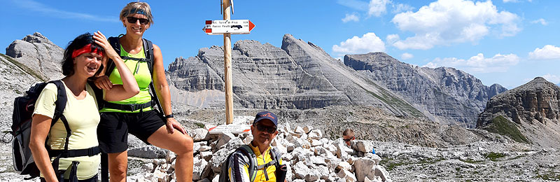 | Mo. | Contrin Haus – Rifugio Passo Valles 2030 m Im Anblick der grandiosen Marmolada Südwand steigen wir zuerst über schöne Wiesen, dann durch felsiges Gelände bis zum Fuß des Sasso Vernele auf. Vorbei an alten Holzkreuzen und Stacheldraht aus dem 1. Weltkrieg, geht es zum Passo Cirelle 2683 m (hier verlief die Grenze zwischen Italien und Österreich) mit herrlichem Blick auf die Cima Ombretta, den Sasso Vernele und die Cima Uomo. Der Abstieg in das grüne Fuciade Becken erfolgt über steile Schotterhänge unterhalb der Cima Ciadine. Eine Forststraße bringt uns vom Rifugio Fuciade zum San Pellegrino Pass 1907 m, wo wir mit der Seilbahn zum Col Margherita auf 2550 m auffahren. Abstieg bis zur Forcella di Pradazzo 2220 m und über den Dolomiten Höhenweg Nr. 2 zum Passo Valles. Übernachtung im Rifugio Passo Valles. Gehzeit: ca. 7 Stunden - Höhenmeter: Aufstieg 1000 m, Abstieg 980 m – Km 16,5 |
